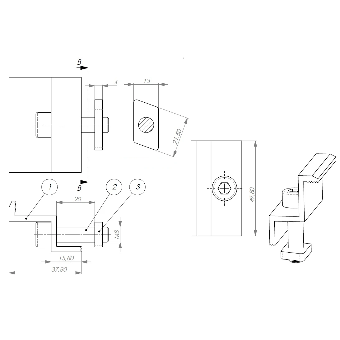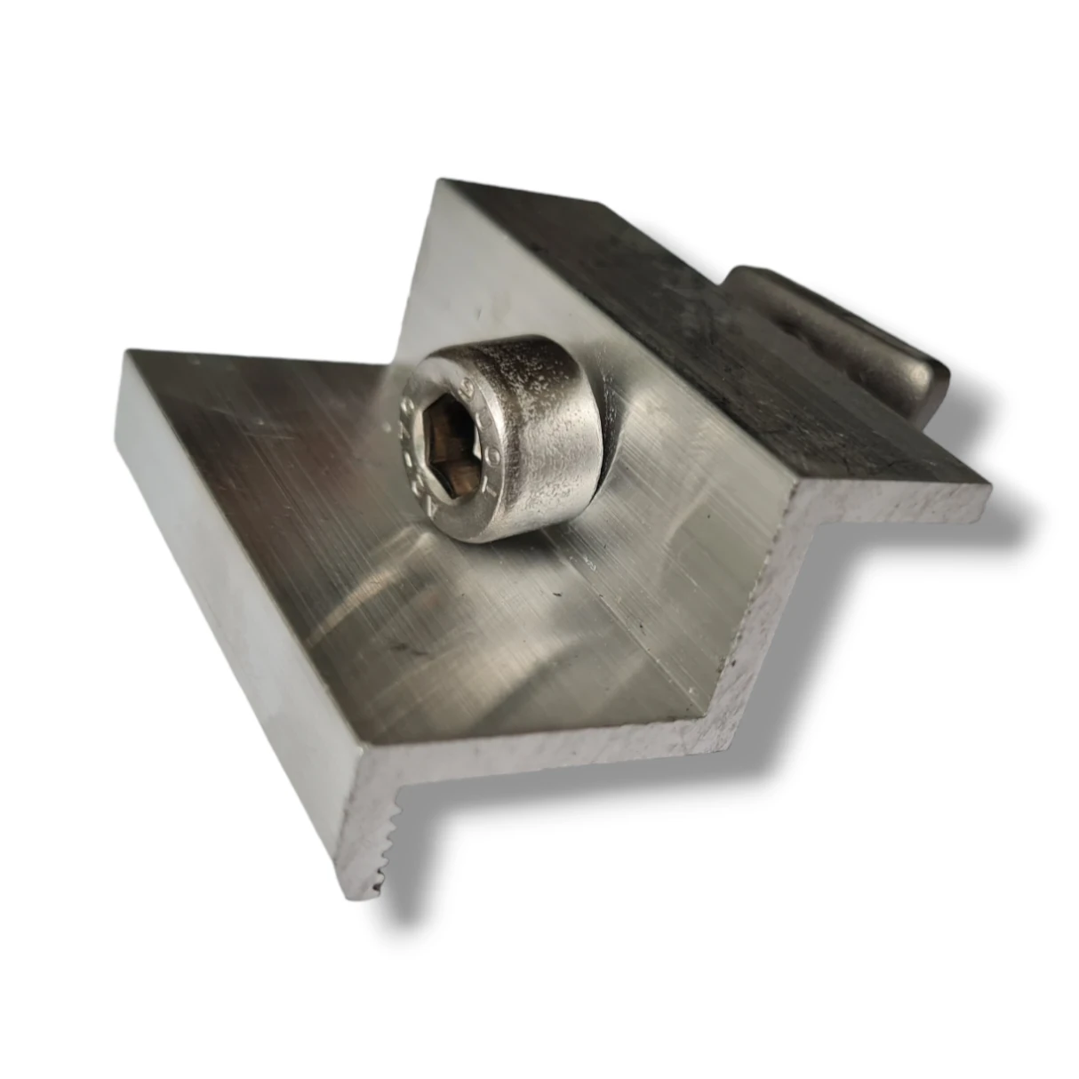 35 mm šoninis spaudimo gnybtas su varžtu ir įdėklu, pagamintas iš aliuminio 6060, skirtas 35 mm fotovoltiniams moduliams tvirtinti DIN 912 M8x25 varžtais.