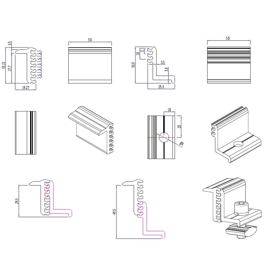 Reguliuojamas šoninis spaudimo gnybtas, skirtas 30-50 mm aukščio fotovoltiniams moduliams. Šis universalus spaustuvas turi unikalų slankiojančių griovelių mechanizmą, leidžiantį lengvai reguliuoti jo dydį, kad jis atitiktų skirtingo storio saulės kolektorius. Saugiai ir tiksliai pritvirtinkite saulės kolektorius prie montavimo sistemų.