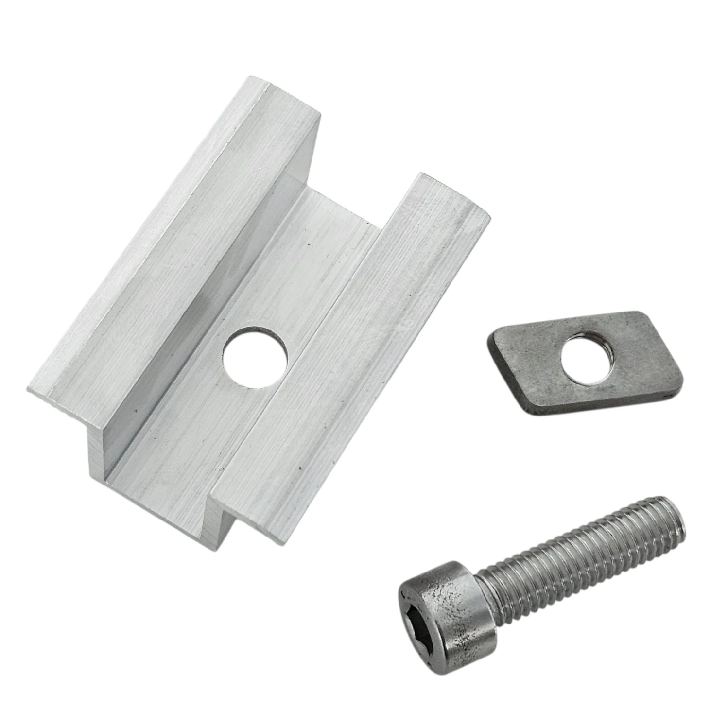 Vidurinė prispaudimo spaustukas H25 L50 su varžtu M8x25 ir įdėklu iš aliuminio 6060, skirtas 35 mm fotovoltinių modulių montavimui naudojant varžtus DIN 912.